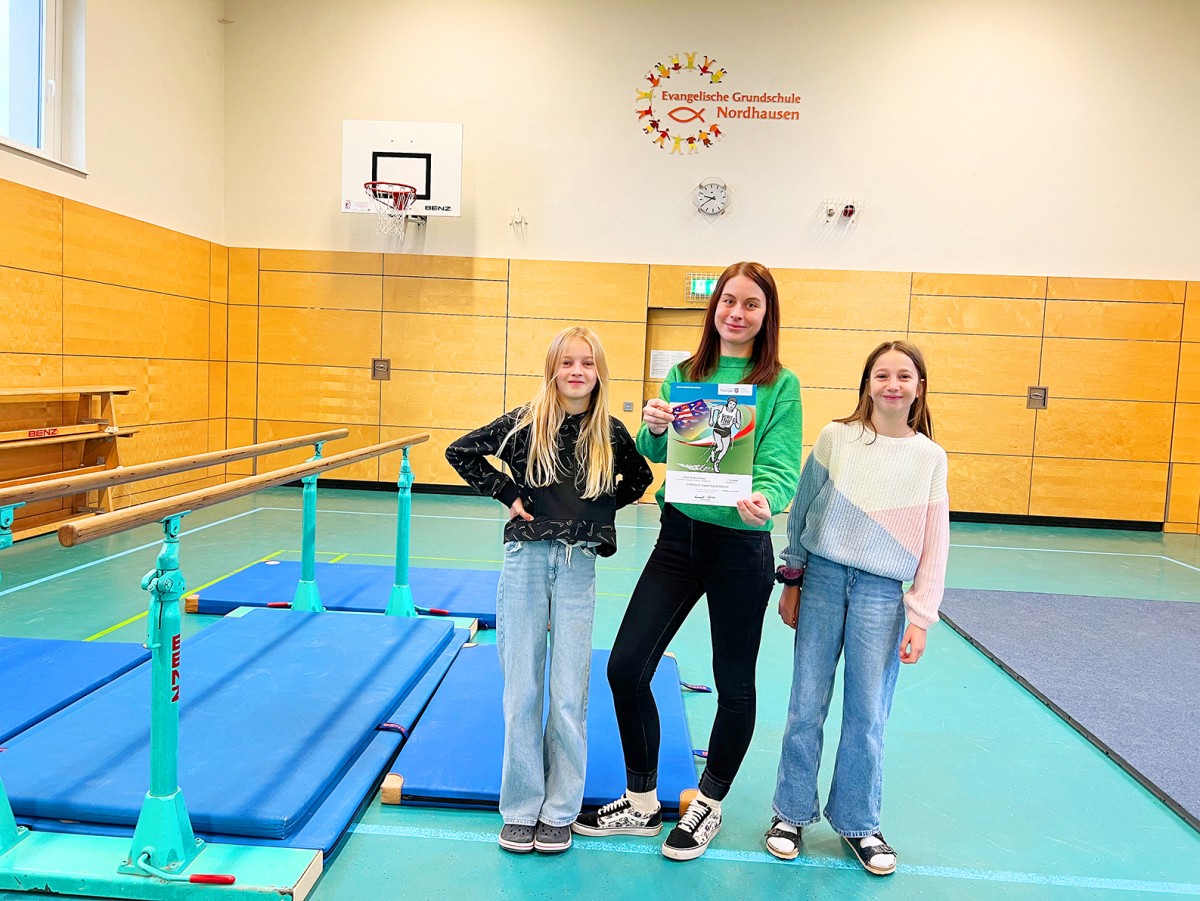 Die Evangelische Grundschule Nordhausen belegte den 1. Platz beim Kreisfinale im Crosslauf in der Mannschaftswertung Jahrgang 2013 weiblich. Schulleiterin Tina Kallmeyer gratuliert den beiden Läuferinnen Ellie Lange und Paula Hilger der Klasse 4a, die den Mannschaftstitel gewonnen haben. Die Freude über den 1. Platz der Schule ist sehr groß, sagt Kallmeyer, auch wenn das sportliche Angebot an der Evangelischen Grundschule grundsätzlich nicht auf Leistungsdrill und das Gewinnen von Wettbewerben ausgerichtet ist. „Wir sind zwar eine sportbetone Schule“, sagt Kallmeyer, jedoch werde der Fokus auf eine breitgefächerte Bewegungsförderung und die Entwicklung von sozialem Teamgeist gelegt.